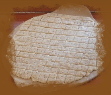 - Poke the dough liberally with a fork and then score it with a knife or pizza cutter into squares of about 1/2 inch.