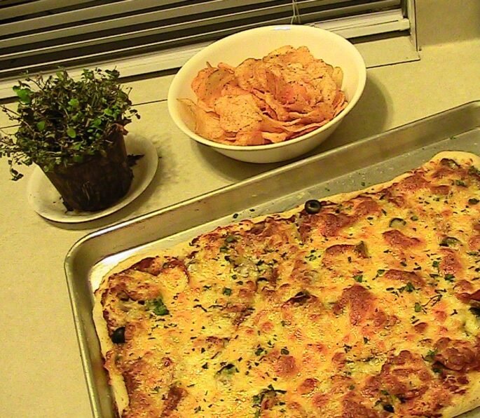 Proof the yeast by dissolving it into 1/2 cup of the warm water in a small bowl. Allow to sit for 10 minutes until it is foamy. Put the other 1 Cup of warm water and the olive oil into the bread maker. Add proofed yeast liquid. Add dry ingredients into bread maker. Set bread maker for “pizza dough” cycle. If you only have a “dough” cycle then use it and set a timer so that you remove the dough in 50 minutes (most dough cycles go for 1 1/2 hours and that will allow the dough for the pizza to rise too high).