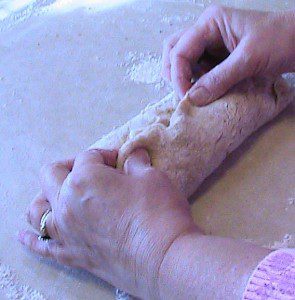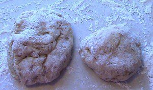 Remove dough to floured counter.  Punch dough down and divide into large and slightly smaller portions.  Allow dough to rest for 5 minutes on counter.