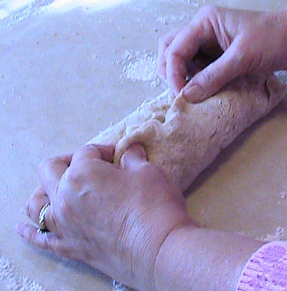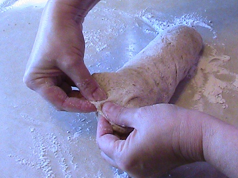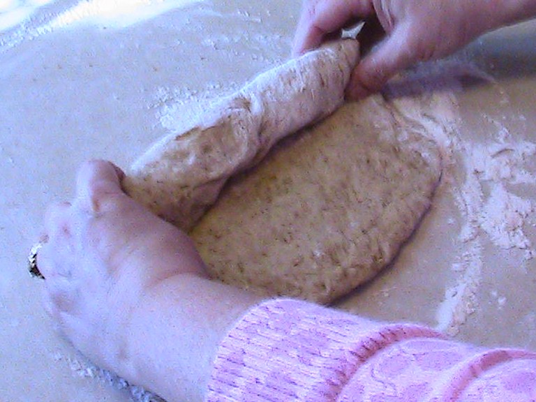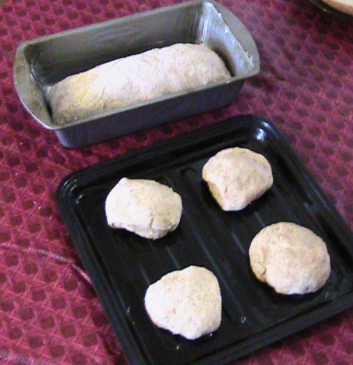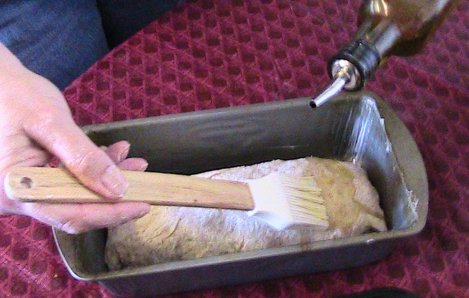 Flatten dough and then roll up into loaf.  Pinch all ends so that there are no gaps.  Place into greased loaf pans (creased side down).  Or you may make rolls by forming dough into balls that are about 2 inches large. Rub olive oil on top of loaves or rolls.  Place waxed paper and then a clean towel over loaves or rolls.  Allow to rise for 1 ½  hours.