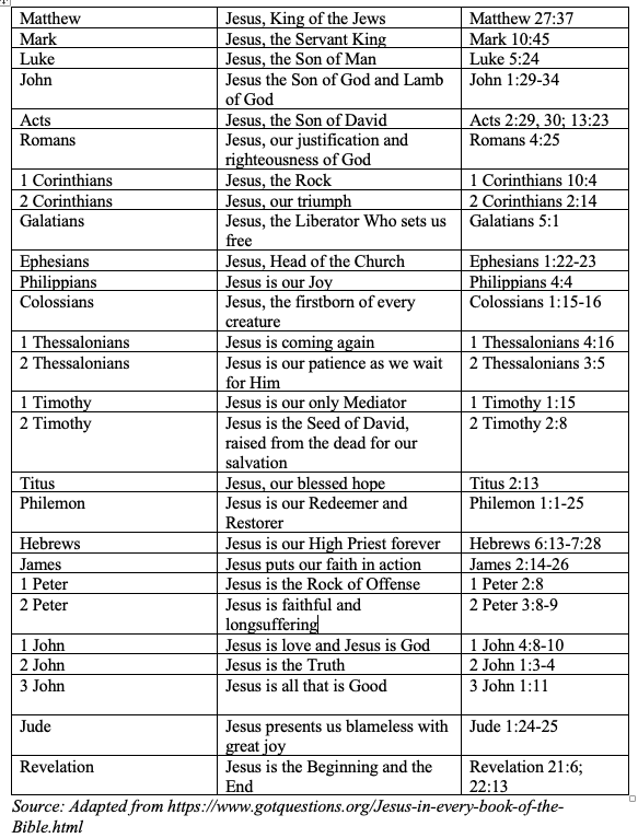 As Christians who study the Bible, we can see that Jesus Christ is the theme of Scripture. His coming is foretold in every book of the Old Testament and His life on Earth is documented in the Gospels of Matthew, Mark, Luke and John as well as the Book of Acts. As in the Old Testament, the Epistles tell of His return. The picture of Christ is painted throughout the entire Bible (See figures 1 & 2 below).