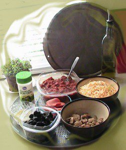 Gather your pizza toppings so that when the dough is ready you can assemble for yummy pizza pie.