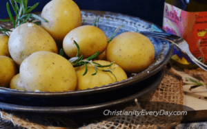 Wash and dry new potatoes or wash and dry and then largely chop some golden yellow or red potatoes. Leave the skins on. Put potatoes into a large bowl. Pour extra virgin olive oil over the potatoes and add salt and pepper, seasoned salt, thyme and rosemary. Toss potatoes in bowl with hands to coat with oil and seasonings. Pour coated potatoes into baking dish including the oil and bake uncovered in oven at 375 for ½ hour. Toss potatoes and then add chicken stock and cover with foil. Place a baking sheet under your pan now in case it boils over. Bake an additional 30-35 minutes until potatoes are tender. Drain liquid and put potatoes onto serving dish. Top with garnish of fresh chopped herbs right before serving.