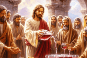 Jesus pours wine into glasses with men standing nearby