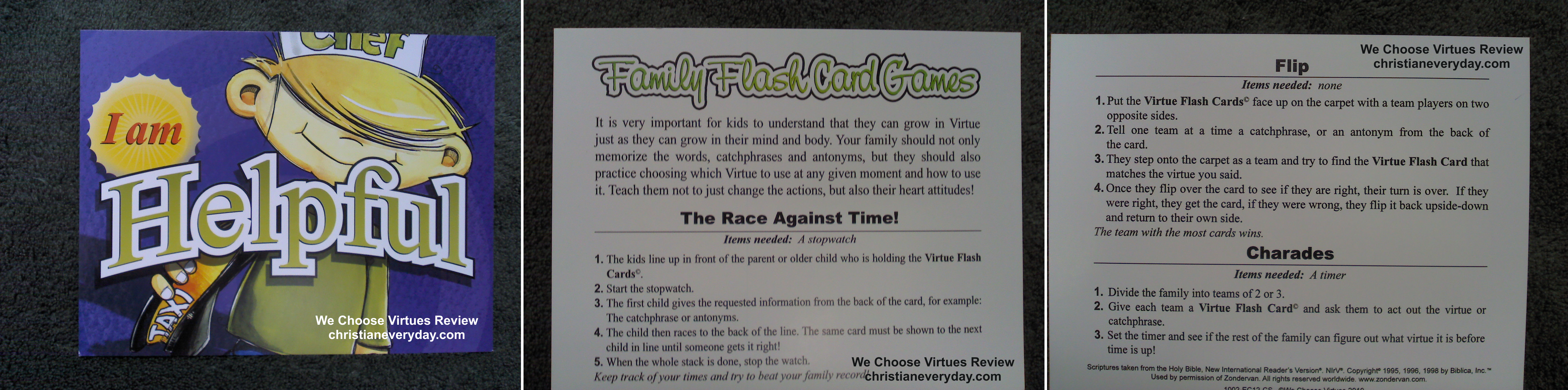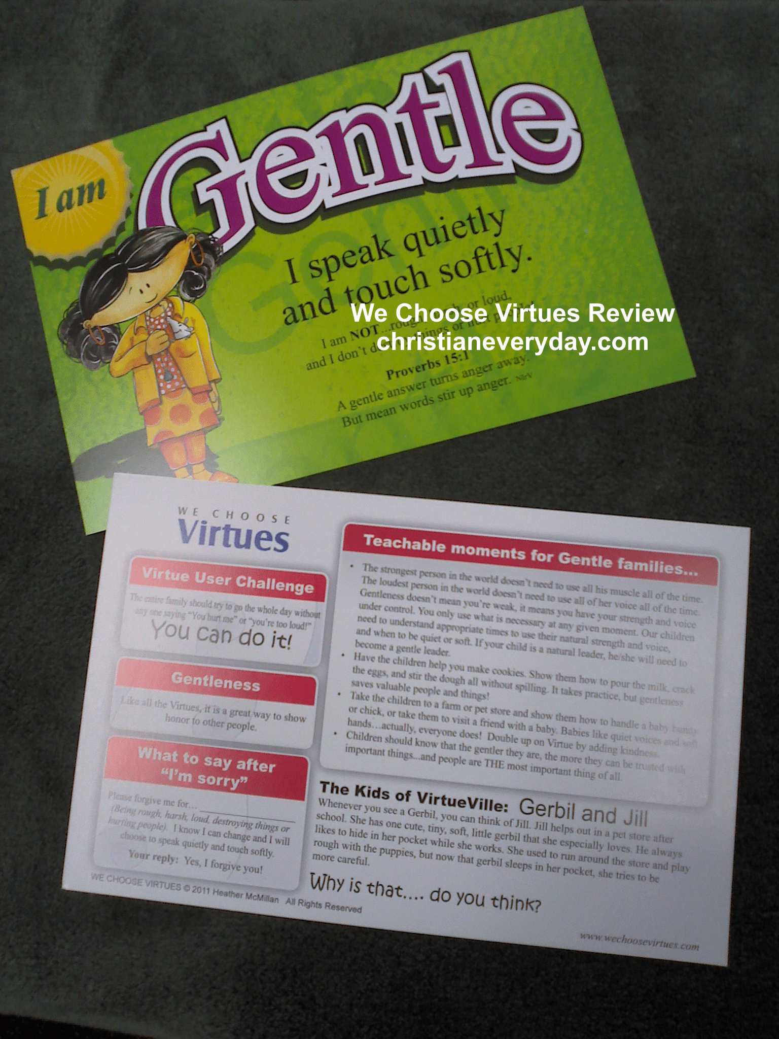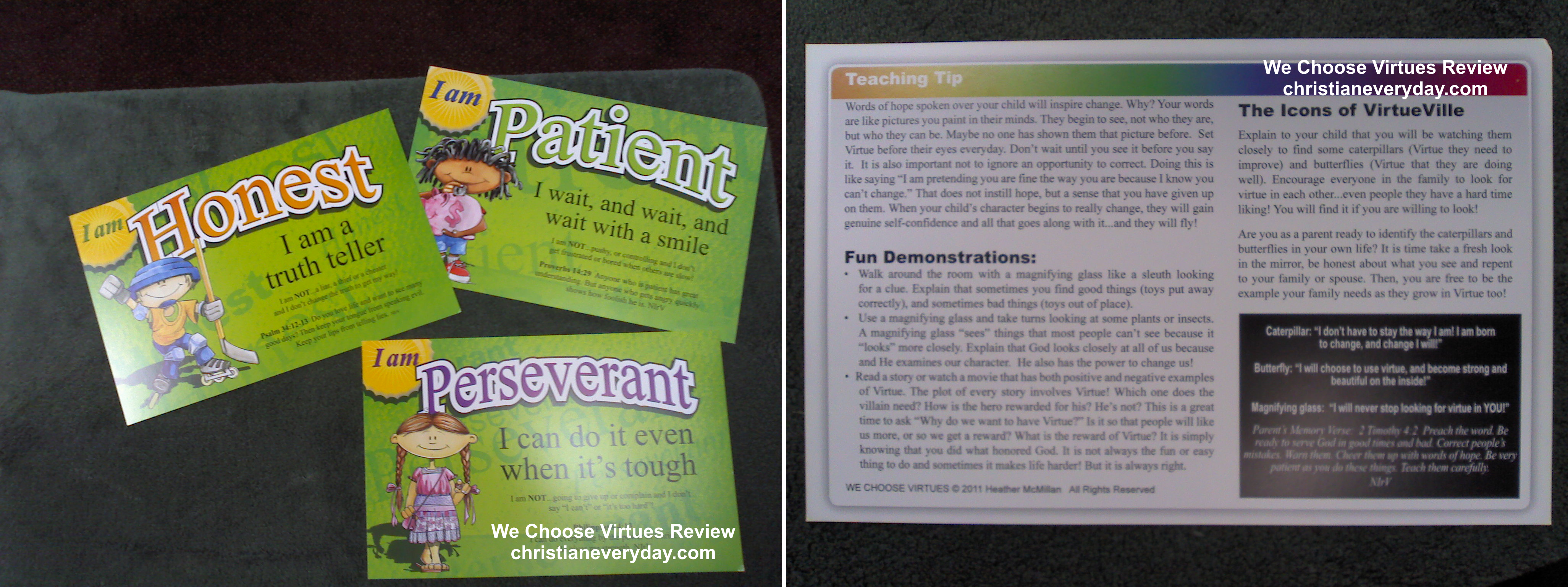 The kit that I received for review is printed in the New International Reader’s Version of the Bible and I am happy to say that it is also available in the King James Version. So sorry I forgot to mention my version preference to Heather earlier. We Choose Virtues is even available in a Secular version — and the Parenting Cards have Bible verses even on those!
